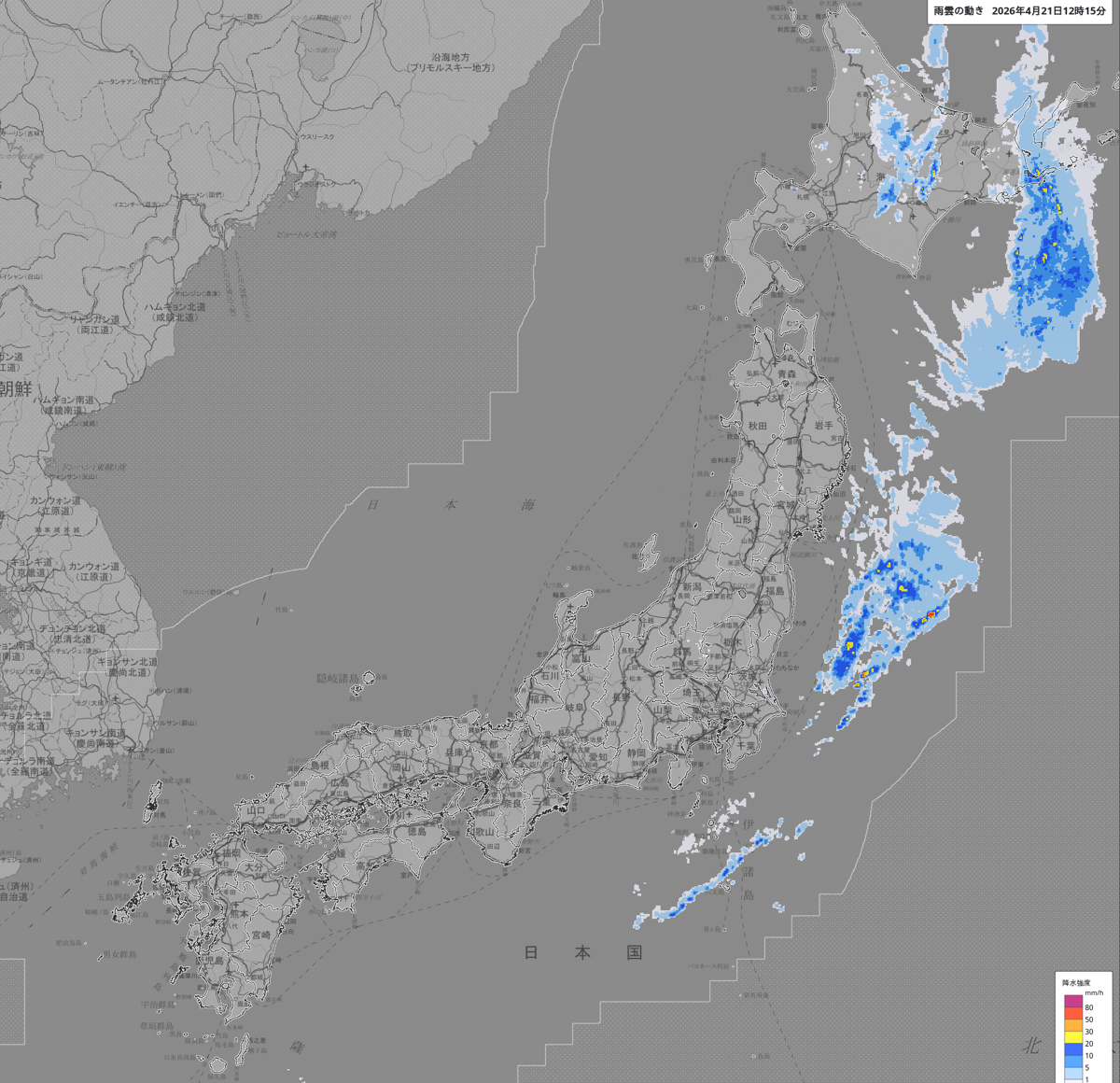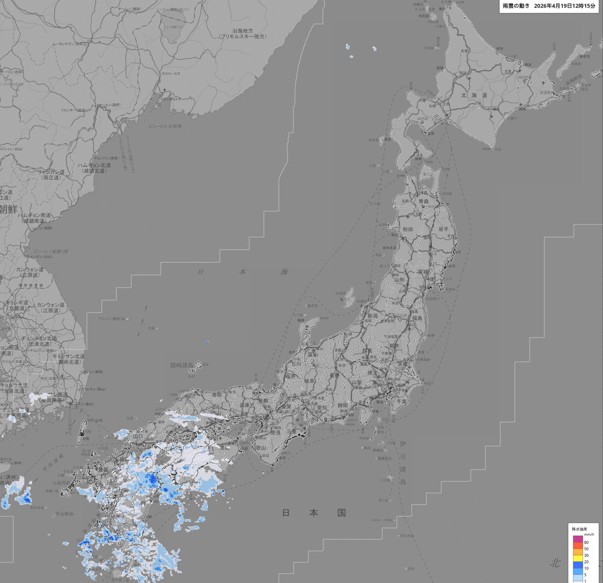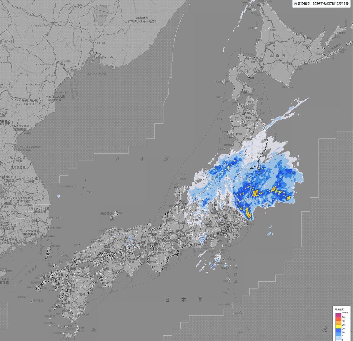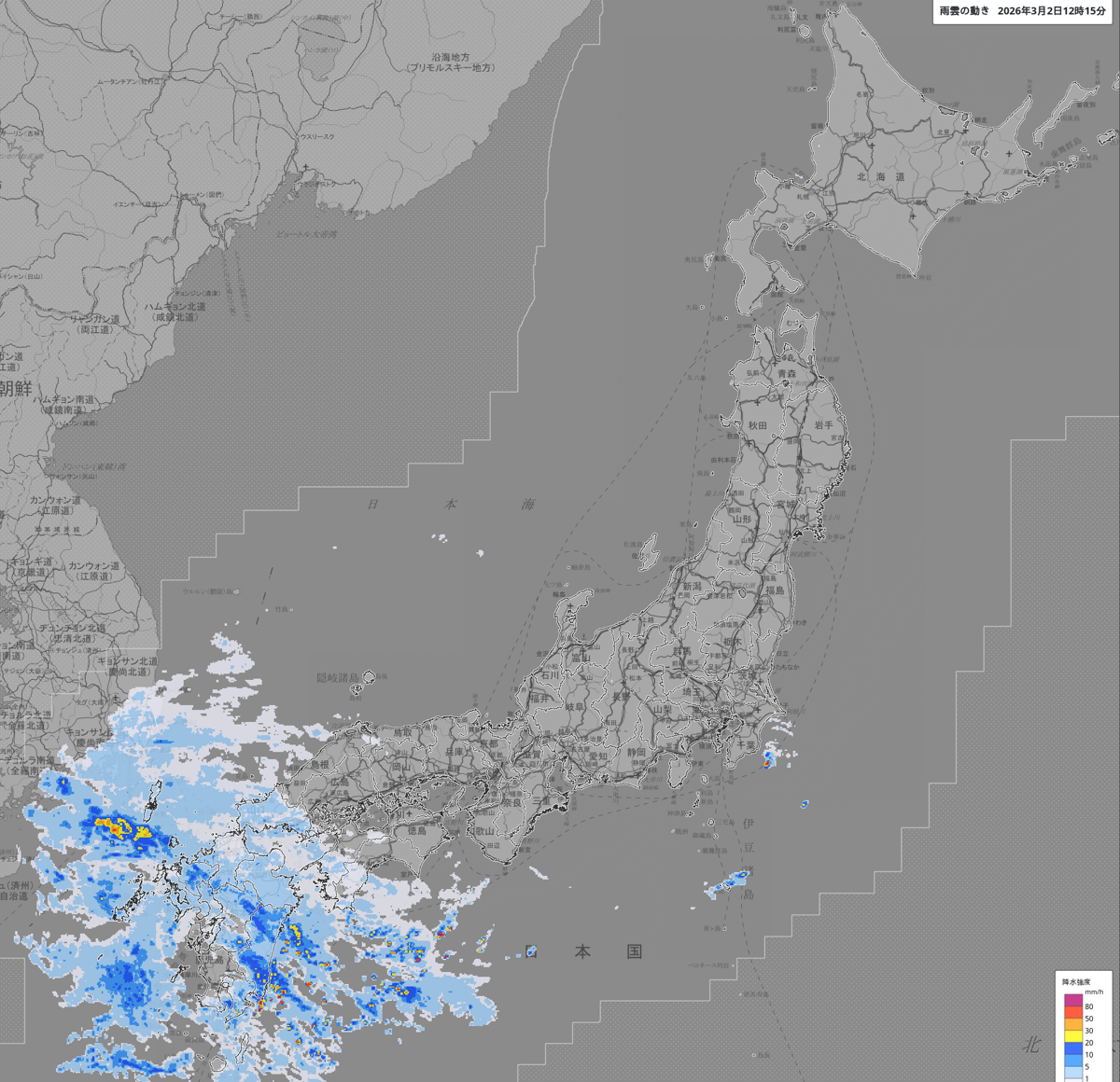 雨雲の動き: https://www.jma.go.jp/bosai/nowc/#lat:35.155846/lon:138.383789/zoom:5/colordepth:normal/elements:hrpns
