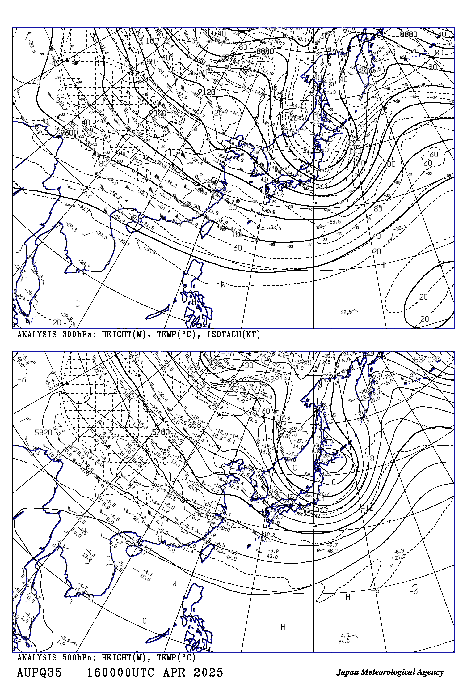 | AUPQ35 アジア500hPa・300hPa 高度・気温・風・等風速線天気図 | |